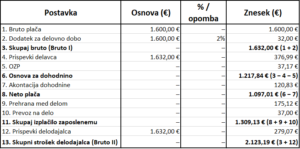 Na ta način je jasno razvidno, kolikšen del bruto zneska prejme zaposleni in kakšen je dejanski strošek delodajalca.
