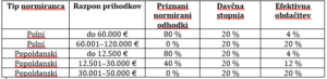 Predlagane spremembe prinašajo tudi drugačno razporeditev normiranih odhodkov in davčnih stopenj. Priznani normirani odhodki se bodo razlikovali glede na vrsto normiranca in višino prihodkov. Pregledno je prikazano v spodnji tabeli: